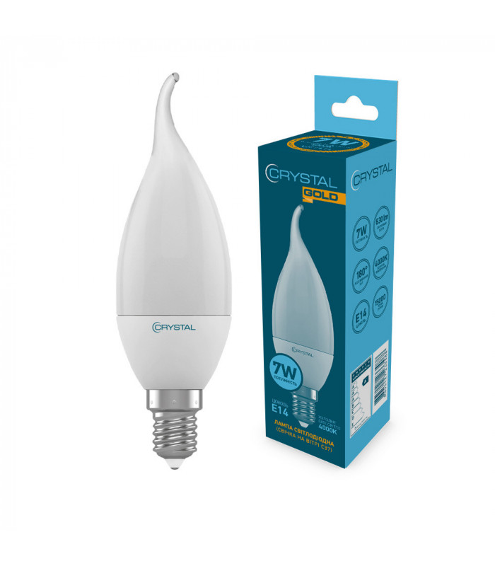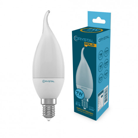 Лампа світлодіодна свічка на вітрі Crystal Gold відрізняється не тільки стильним дизайном, але й має відмінні технічні характеристики. Її світловий потік дорівнює 630 lm, а кут розсіювання – 180 градусів. Ці LED лампочки призначені для побутового використання в таких освітлювальних приладах, як люстри та бра. Вони мають цоколь типу E14.