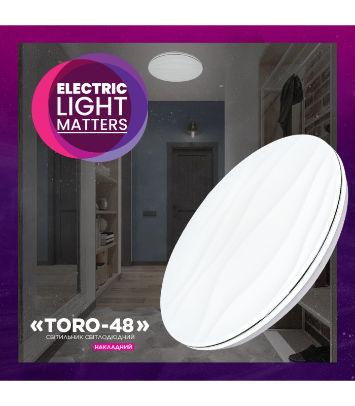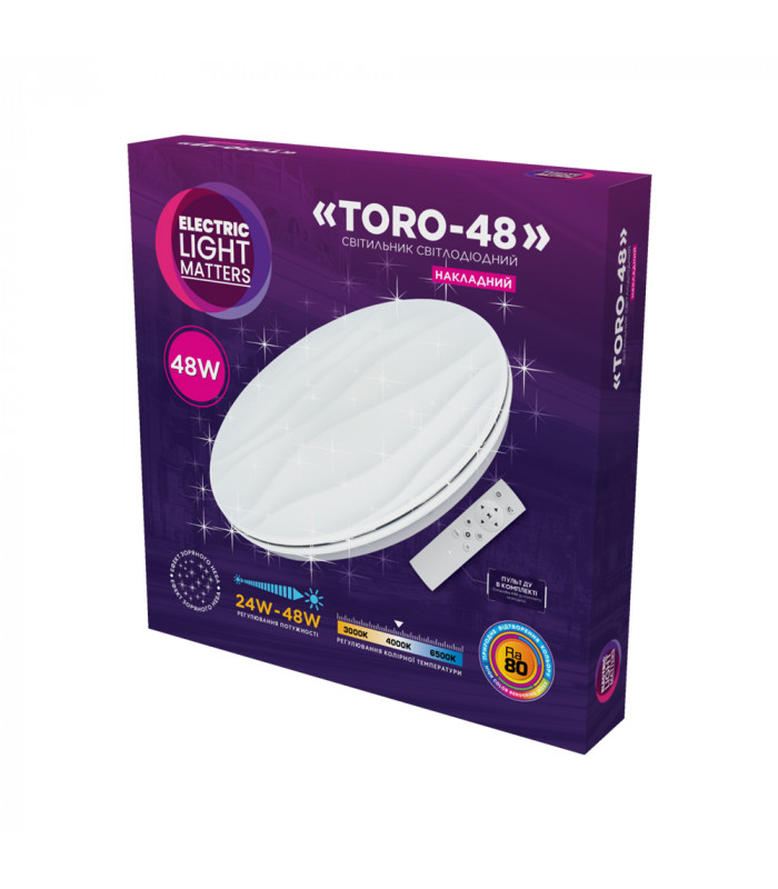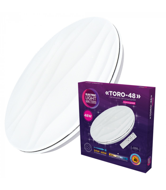 Світлодіодний світильник ELM Toro 48 Вт - сучасне універсальне рішення для освітлення житлових та офісних приміщень. Стильний дизайн, ефект «Зоряне небо» та зручне керування з пульта роблять модель не лише функціональною, а й декоративною частиною інтер’єру. Опаловий розсіювач забезпечує м’яке, рівномірне світло без мерехтіння, а колірна температура 3000K–6500K дозволяє створювати потрібну атмосферу – від теплого до холодного відтінку.