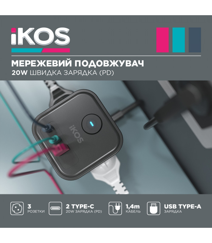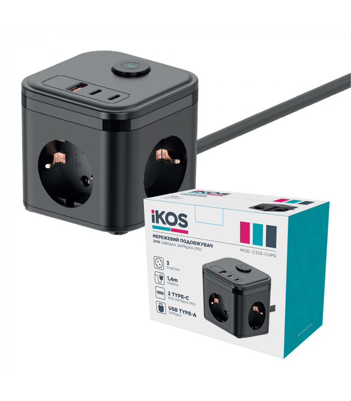 Мережевий подовжувач iKOS – універсальне рішення для зручного підключення техніки та швидкого заряджання мобільних пристроїв. Завдяки компактній формі та сучасному дизайну він легко розміщується на робочому столі, тумбі або в обмеженому просторі, забезпечуючи порядок і комфорт у щоденному користуванні електронікою.