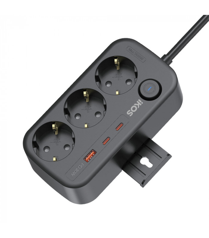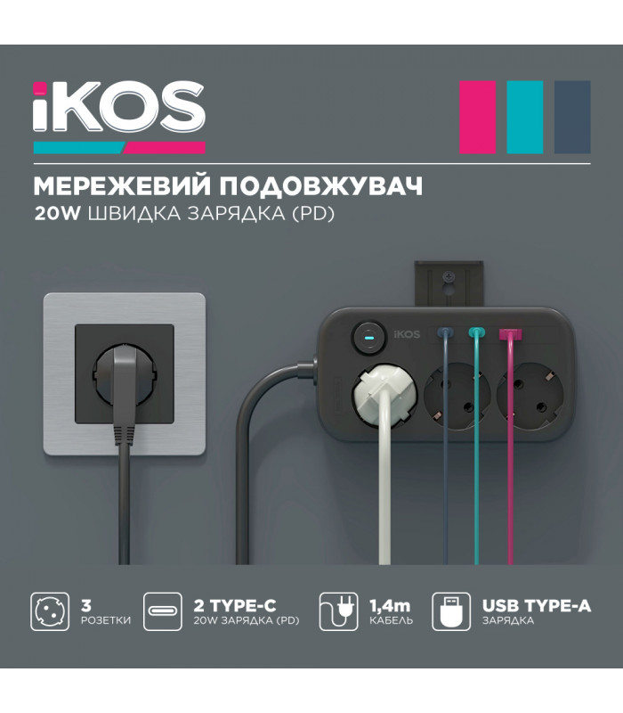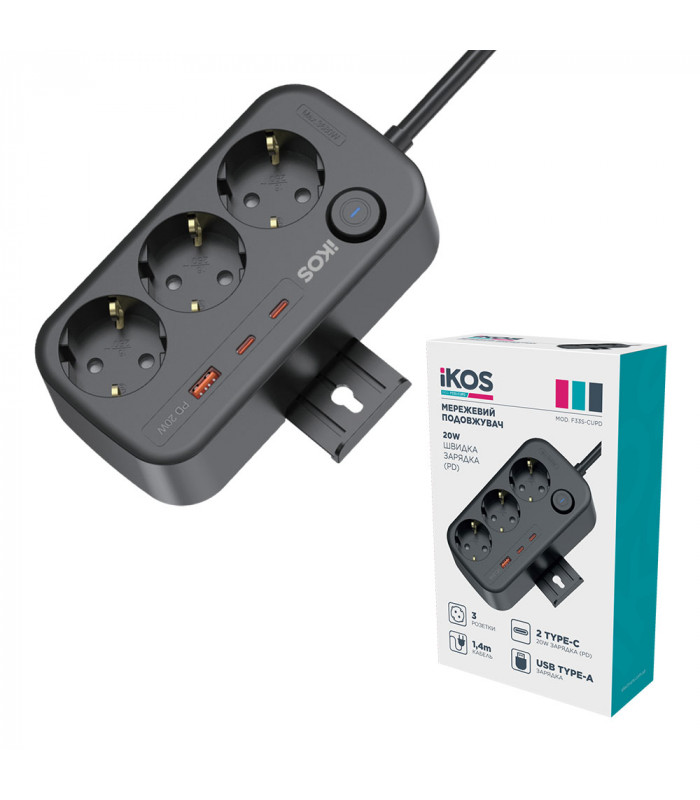 Мережевий подовжувач iKOS стане надійним рішенням для дому, офісу чи робочого простору, забезпечуючи одночасно електроживлення техніки та швидке заряджання мобільних пристроїв, організовуючи робоче місце зручно та безпечно.