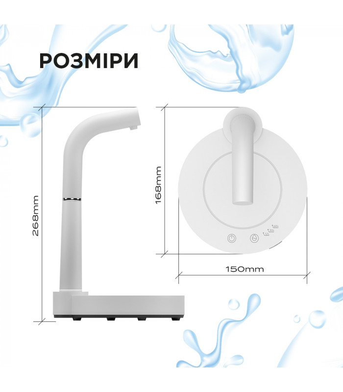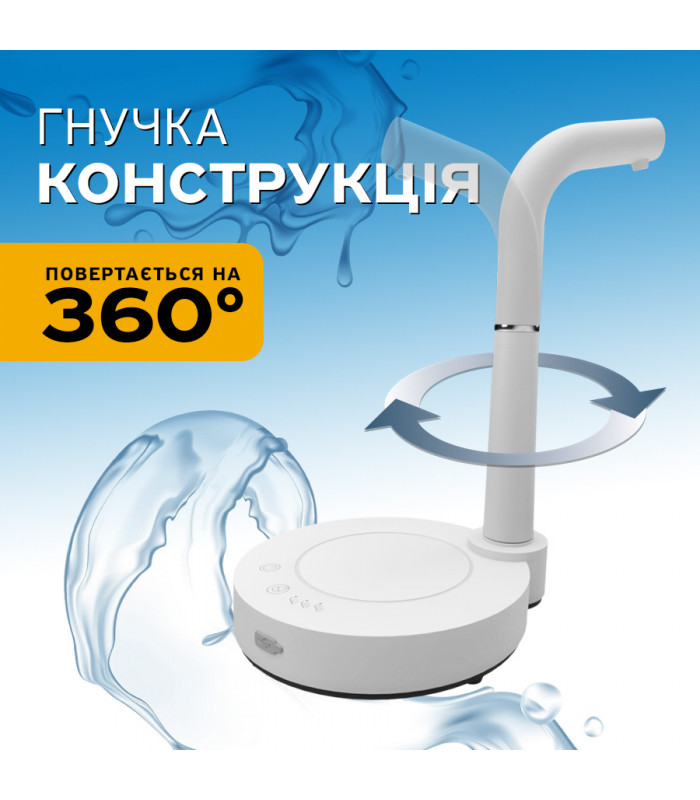 Пристрій має кілька режимів наливу, завдяки чому можна наповнити як невелику чашку, так і більшу ємність. На спеціальну основу можна поставити склянку, тому руки залишаються вільними. Помпа виготовлена з безпечних матеріалів, має сучасний мінімалістичний дизайн і працює від вбудованого акумулятора 1200 мАч, який легко заряджається через USB (Type-C).